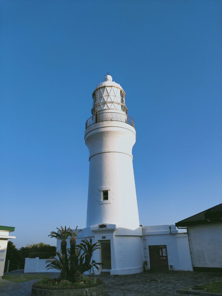 灯台の雄姿。真っ白の胴体が神々しい。空の青さとのコントラストが眩しい。