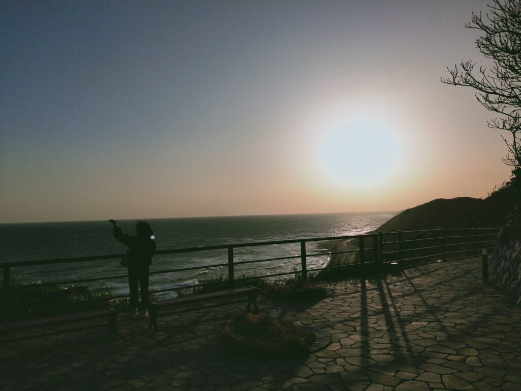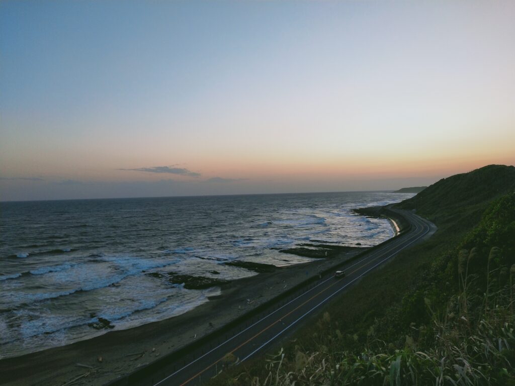 灯台がある高台からの眺め。海岸通りがずっと続く先に夕日が沈んだ。